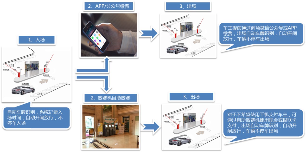 臨時車輛車牌識別不停車進(jìn)場,手機(jī)/自助繳費(fèi)機(jī)自助繳費(fèi)后不停車出場,給臨時車輛帶來極佳的停車體驗(yàn)。