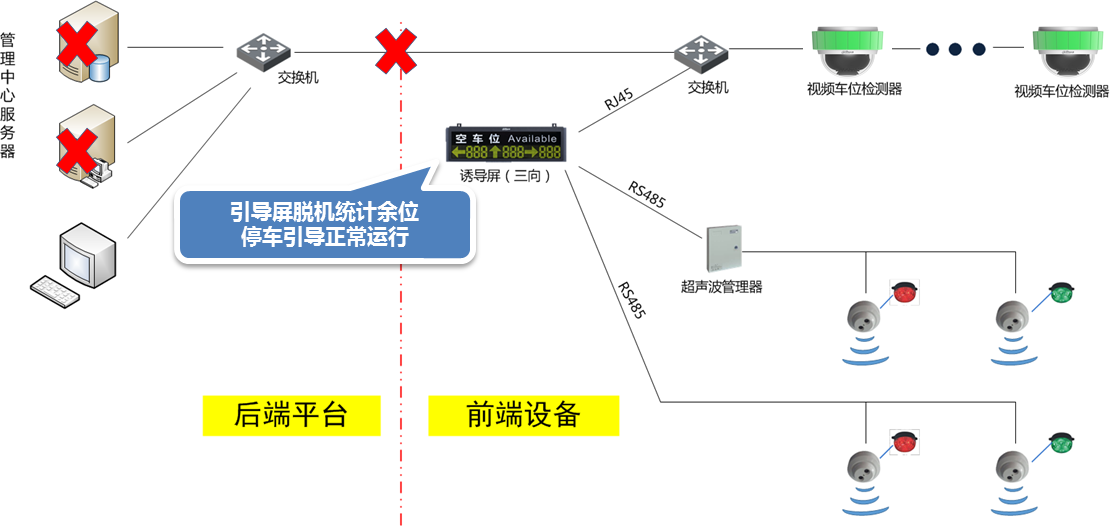 管理服務(wù)器故障或網(wǎng)絡(luò)異常時,引導(dǎo)屏脫機(jī)統(tǒng)計(jì)余位,停車引導(dǎo)系統(tǒng)仍可正常運(yùn)行。